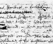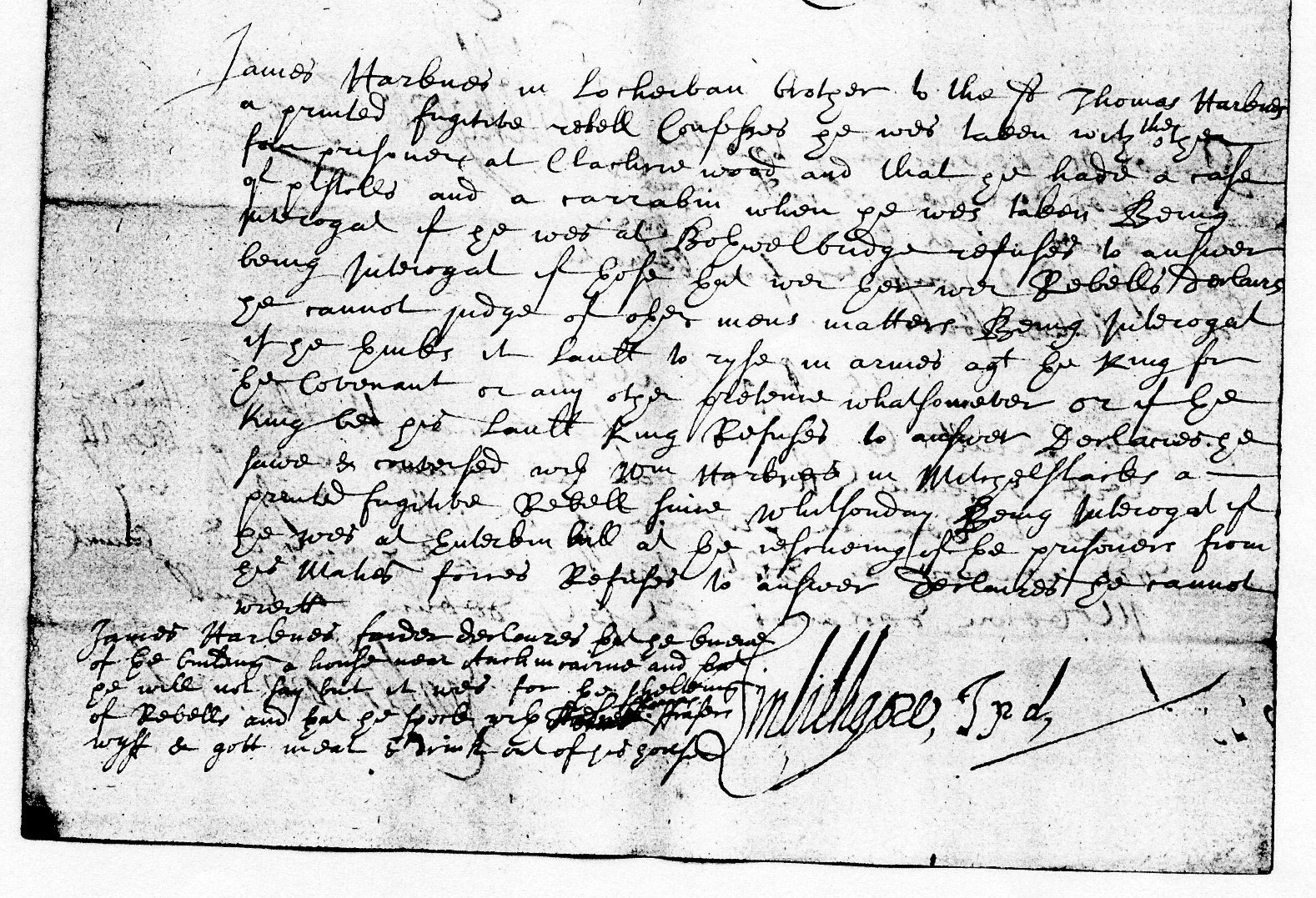 Thomas Harknes in Locheibane a printed fugitive rebell confesses he wes taken with the other four prisoners in armes with a carabin or fouling piece And wes with thrie of them who wer in armes the day befor declaires he dwelt befor in Locheibane befor Whitsonday but refuses to condescend wher he stayed sensyne. ( Refuses to owne the King as his laufull King. – crossed out). Being interogat if it be laull to ryse in armes against the King or his authoritie upon pretence of the covenant or any other pretext whatsoever Refuses to answer Declaires he was in company with Wm Harknes in Mitchelslacks a printed fugitive rebell within ther tuentie dayes (And wes in company with John Coupland in Drumcork another of the printed rebells with….. – crossed out). Declaires he ownes the King only in sua farre as he walks according to the word of God Being interogat if these that wer at Bothwelbridge wer Rebells sayes if they wer against God they wer rebells Declaires he cane wreit but will not signe this his declaration.