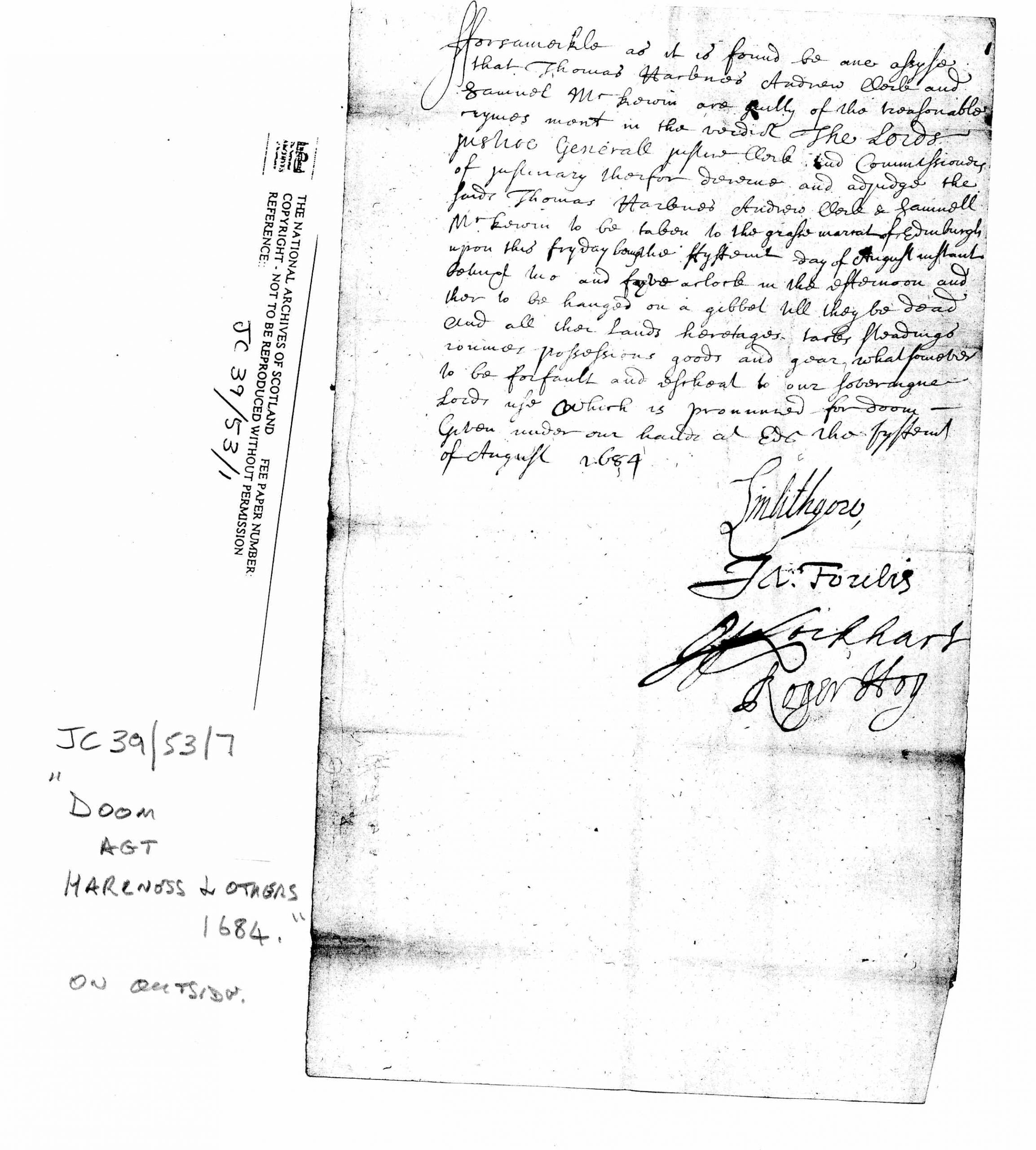 “Forasmuch as it has been found by ane assize that Thomas Harknes Andrew Clark and Samuel McEwan are guilty of the treasonable crymes wont in the verdict The Lords Justice General Justice Clerk and Commissionars of Justiciary therefor devine and adjudge the said Thomas Harknes Andrew Clark and Samuel McEwan to be taken to the Grassmarket of Edinburgh upon this Friday being the fifteenth day of August instant between two and five o’clock in the afternoon and there to be hanged on a gibbet till they be dead and all their lands heritages tacks stedddings roumes possessions goods and gear whatsoever to be forfeit and as cheat to our sovereign Lord and so which is pronounced for Doom –