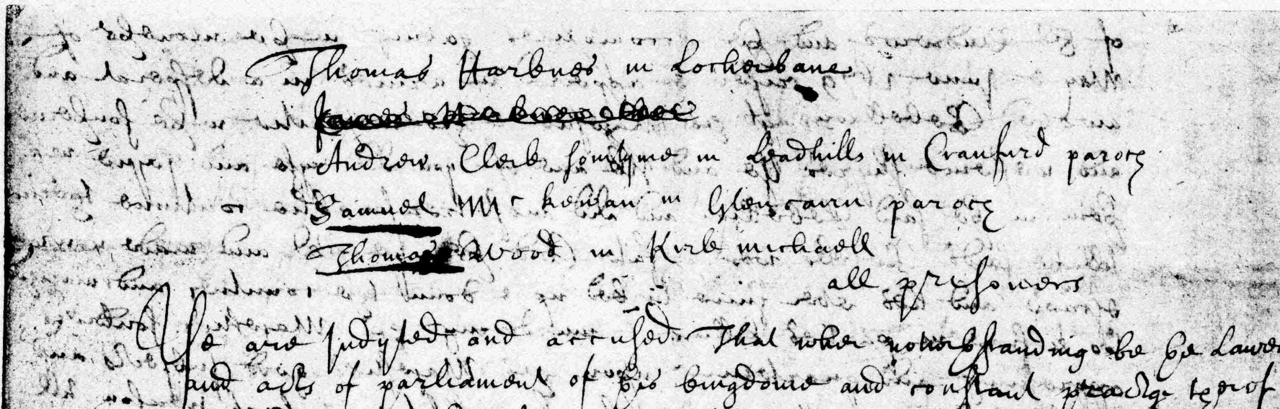 Ye are indyted and accused That wher notwithstanding be the lawes and acts of parliament of this kingdome and constant proclamations therof particularly be the 3d act 1 par: K James the first 14 act 6 Parliament & 49 Act 12 Par: K.Ja.2d. 97 Act 7 Par.K.Ja.5th 144 Act 12 Par.K.Ja. the sext It is statut and ordained that no man oppenlie nor nottorlie rebell against the Kings person or authoritie or make war against the King’s leidges or wilfullie receyt maintaine or doe favour to or recept supplie or intercomon with or give any meat drink house harbour or any releif or comfort or anywayes aid abait assist or give help red or councillto Rebells & traitors under the paine of treason viz forfaulture & escheat of lyff land and goods. And be the 5t act of the first session of his Majesties first parliament It is declaired to be high treason to be subjects of this realme or any number of them more or lesse upon any ground or pretext whatsomever to ryse or continue in armes to make peace or warr or any treaties or leagues with forraigne princes or estates or amongst themselves without his Majesties special authoritie & approval first interponed thereto And be the 2nd act 2d session of his Majesies 1 par: it is declaired high treason for any of his Majesties subjects to maintaine these positions that it is lawfull for subjects upon pretence of Reformation or any other pretence whatsoever to enter into leagues or covenants or to take up armes against ther king or those commissionat by him or to putt limitations upon ther dewe obedience & allegeance and it is therby statut and ordained that if any person or persons shall by writings printing or other malitious and adwised speaking expresse & declaire ther treasonable intentions of depryveing deposeing or suspending of his Majestie from the style honour & kinglie name of the Imperiall crown of his realme or from the exercise of his Royall government or to levie warr or take up armes against his Majestie or any commissionat by him or even to maintaine this position that it is lawfull for subjects pretending his Majesties authoritie to take up armes against his person or those commissionat by him efter such person or persons being upon sufficient probation legallie convict therof they shall be deemed adjudged & declaired traitors and shall suffer forfaulture of lyff honour land & goods as in the case of high treason Nevertheless it is of veritie that the saids Thomas Harkness Andrew Clerk Samuel McKewan & Thomas Wood shaiking off all fear of God respect and regard to his Majesties authoritie & lawes have presumed to commit and are guilty of the crymes in sua farr as the bloodie & sacrilegious murderers of the late archbishop of St. Andrews and ther accomplices in the moneth of May & June 1679 refer & appeired in armes in a desperate andavowed Rebellion against his Majestie & his authoritie in the southerne and westerne shyres Ye and ilk ane of ye did ryse and joyne with them in the said Rebellion and did most treasonablie continue therin till the saids rebels wer defate And then ye fled and made your escape and hes ever since lurked up down the country and marched to & frae in parties killing & murdering his Majesties souldiers oppressing and quartering upon his Majesties good subjects and people and committing all acts of hostilitie & high treason till at lenth ye wer taken & apprehendit being all well armed with swords pistolls carrabins & guns well charged & loaden and ther wes found upon you great balls and slugs and other ammunitions and militarie provision And ye hade the boldness to oppose the partie of his Majesties forces who apprehendit you by force of armes and would not throwe them doun nor begg quarteris & mercy but did most treasonablie resist & snapd your guns upon them and would not yeild till ye wer overpowered and taken at (blank) upon the (blank) day of August instant And ye being brought in prisoners and examined befor the Lords of his Majesties Privie Counsell & Lords of Justiciary Ye the said Thomas Harknes hes confest that ye wer taken with other four prisoners in armes with a carrabin or fouling piece And that ye wer with three of them in armes the day befor and that ye have treasonably conversed with Wm Harknes in Mitchelslacks a printed fugitive rebel within thir twentie dayes in your own hill land And all of you most treasonablie & obstinatlie refuse to declaire it unlawfull for subjects to ryse in armes against his Majestie or his authoritie upon pretence of the Covenant or any other pretence whatsoever or to owne the King & his authoritie as lawfull and according to the word of God or to call the ryseing in armes at Bothwell Bridge a rebellion or those that rose ther rebels or to pray for the King And ye most obstinatlie refuse to declare or purge yourselves of being with these rebels who opposed a partie of his Majesties forces at Enterkin hills & refried some prisoners from them upon the (blank) day of July last or to give ane accompt wher ye have stayed & lived or bein harboured Wherthrowe it is evident that it is your principle and that you maintaine and doe owne the treasonable positions above mentioned prohibit be the lasws & acts of parliament abovespecifiet Viz That it is lawfull for subjects to ryse in armes against the King & his authoritie for the Covenant and that the King & his authoritie are not lawfull nor according to the word of God because against the Covenant and that those who rose in rebellion against the same at Bothwellbridge wer no rebels and your refusing to pray for the King is a clear rejecting & disowneing of him especially when ye declaire it your principle that ye were bound to pray for non but those within the decree of election as ye the said Thomas Wood hes expresslie done when ye wer desyred by the privie councill to pray for the King And your refusing to purge your self of being with the rebells at Enterkinhill is a clear evidence that ye wer ther And your refusing to give ane account wh